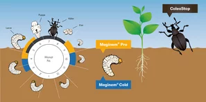 Meginem Cold enthält die Nematoden Heterorhabditis downesi, ist etwas kälteresistenter, und kann bereits ab Bodentemperaturen von 8°C ausgebracht werden, das heisst im zeitigen Frühjahr und im Spätherbst.