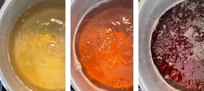 Anfangs ist die Mischung hellbraun und wird zum Ende hin immer dunkler. Siehe Foto rechts. Beim Umrühren schäumt es stark, dieser Schaum ist zuerst weiss und wird zunehmend brauner.