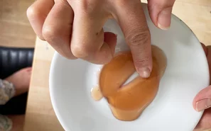 Gegen Ende der Einkochzeit nehme ich gerne ein paar Proben, um die richtige Konsistenz zu überprüfen. Erst nach vollständigem Auskühlen sieht man die effektive Konsistenz. Ist der Aufstrich nach dem Abfüllen zu dünn oder zu dick, wäre dies ärgerlich. Darum lohnt sich die Probe. Dafür gebe ich einen Unterteller in die Tiefkühltruhe und lasse ihn kalt werden. Dann gebe ich einen Klecks aus der Pfanne darauf und lasse ihn vollständig abkühlen (ebenfalls im Tiefkühler). Ist die Probe noch zu flüssig, wird der Aufstrich für weitere 10 Min. gekocht. Die richtige Konsistenz ist erreicht, wenn die ausgekühlte Probe honigartig ist und nur langsam wieder zusammenläuft, wenn man mit dem Finger durch die Probe fährt.