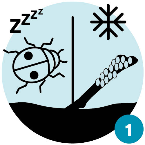 | Winter: Marienkäfer überwintern als ausgewachsene Käfer, versteckt in Ritzen und Spalten. Von den Blattläusen hingegen überwintern meist nur die robusten Eier. | Frühjahr: Ab Temperaturen von 10 °C kommen die Marienkäfer aus dem Winterversteck und suchen Blüten, um Pollen zu fressen. Sobald die Rosen zu treiben beginnen, schlüpfen die ersten Grossen Rosenblattläuse aus den Eiern. |