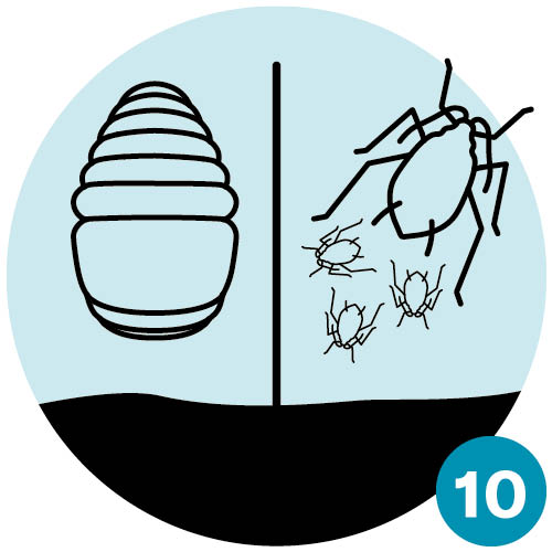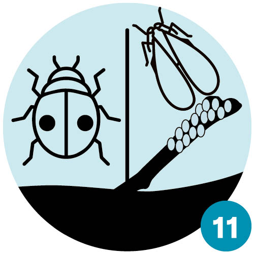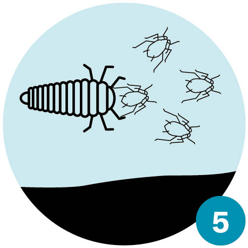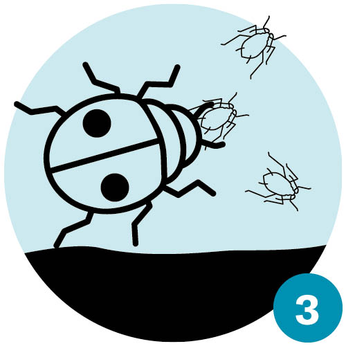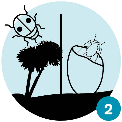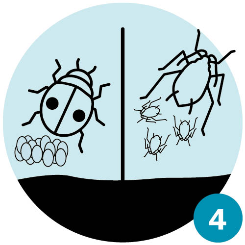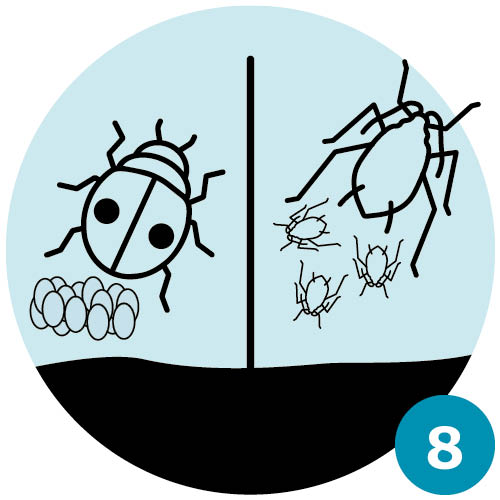 | Frühling III: Aus den Eiern der Marienkäfer schlüpfen Larven, die sich fast ausschliesslich von Blattläusen ernähren. Damit stoppen sie die rasante Vermehrung der Blattläuse. | Frühsommer: Während der Puppenruhe der Marienkäfer «gebären» die verbliebenen Blattläuse weiterhin Junge und die Blattlausbestände erholen sich wieder etwas. |