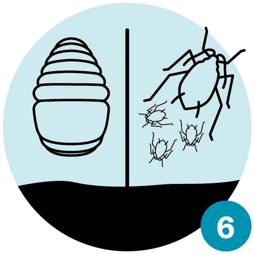 | Spätsommer: Aus den Eiern der Marienkäfer schlüpfen Larven, die sich fast ausschliesslich von Blattläusen ernähren und sie täglich zu Dutzenden vertilgen. | Frühherbst: Während der Puppenruhe der Marienkäfer «gebären» die verbliebenen Blattläuse weiterhin Junge. Diese wachsen nun zu Männchen und Weibchen heran. |
