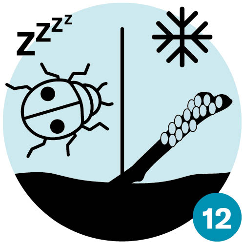 | Herbst: Die geschlechtliche Generation der Blattläuse trägt Flügel. Sie paaren sich und die Weibchen legen Eier zur Überwinterung auf Rosen. Die Marienkäfer ziehen sich ins Winterversteck zurück. | Winter: Marienkäfer überwintern als ausgewachsene Käfer, versteckt in Ritzen und Spalten. Von den Blattläusen hingegen überwintern meist nur die robusten Eier. |