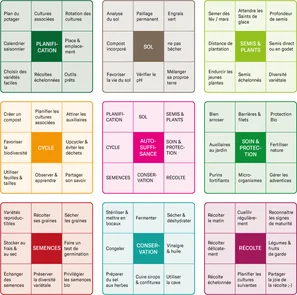 Voici comment cela fonctionne : on commence au centre et on choisit le thème qui nous préoccupe le plus pour le moment. L'arrosage ? La protection des plantes ? Ou bien la planification dans un premier temps ? Chaque case mène au bloc correspondant, qui contient huit idées, tâches ou pistes de réflexion.